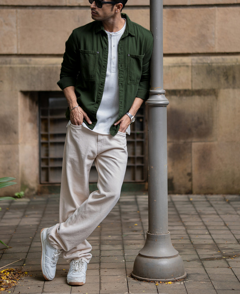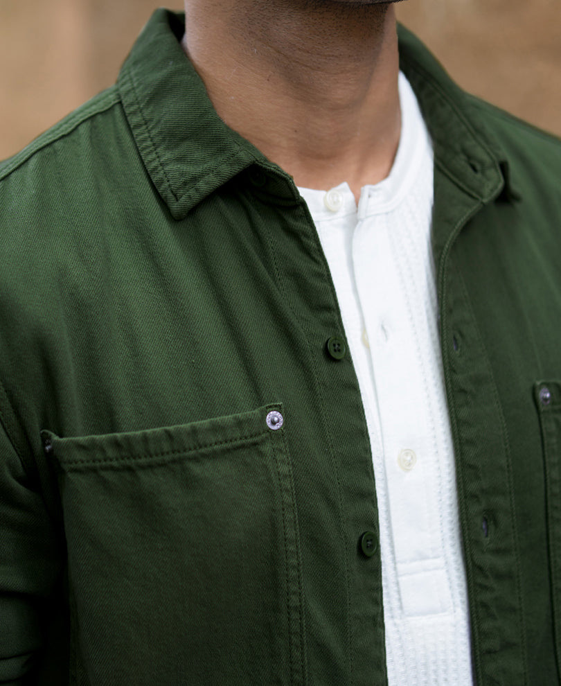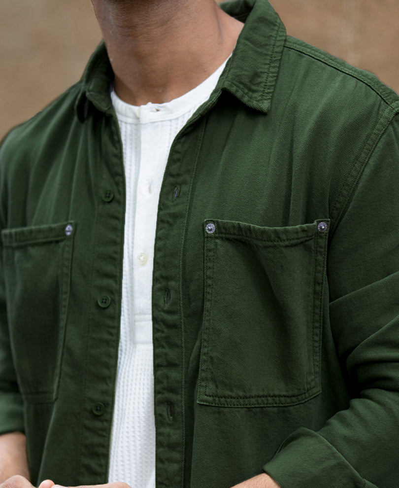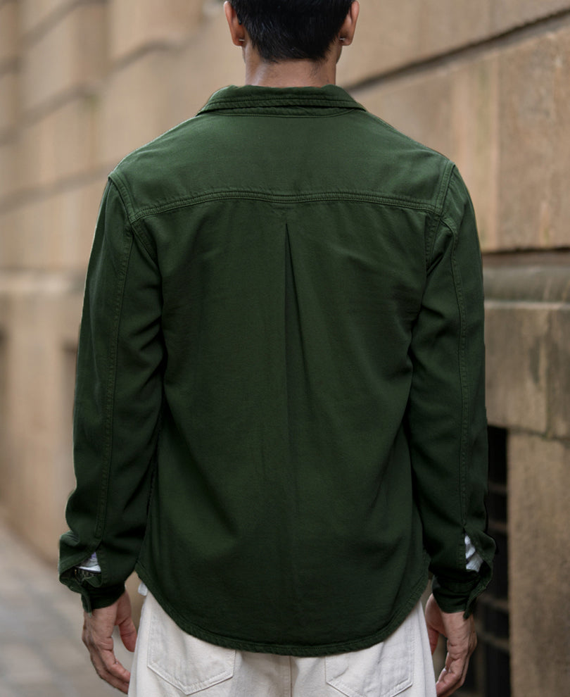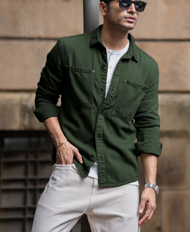Made from textured cotton, this pine green overshirt walks the line between smart and casual. Its rugged weave and earthy tone make it a standout for off-duty looks, while the structured cut keeps things sharp. Style it buttoned up or open over a tee; either way, it adds depth to your outfit.