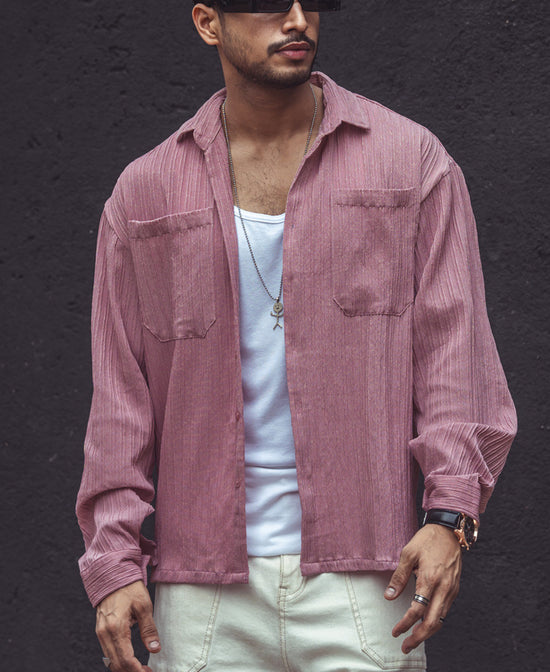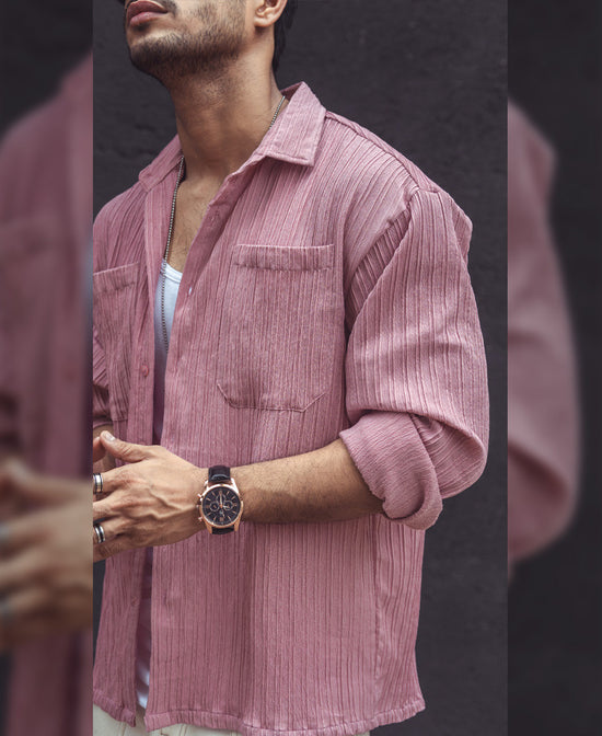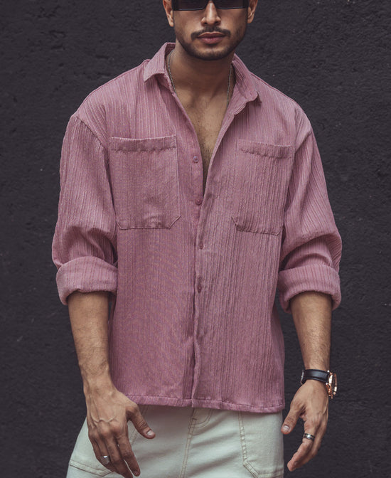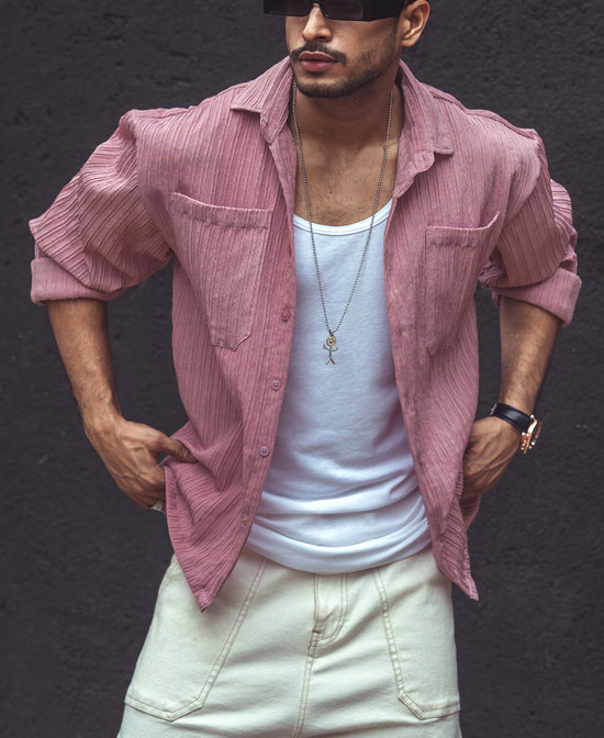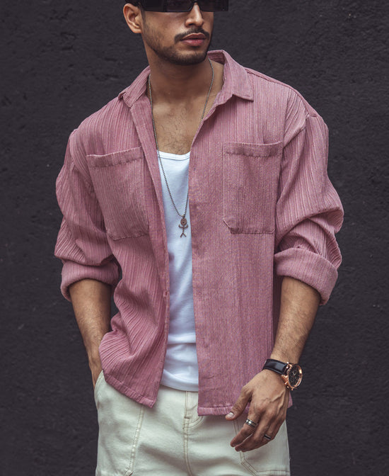 Refresh your everyday wardrobe with our pink double pocket oversized shirts for men, featuring a spread collar, drop shoulders, full sleeves, and rib knit texture. Crafted from textured polyester fabric, the pink oversized shirt offers comfort with a chic twist. Rock the shirt solo or as a layer; all eyes will be on you.
