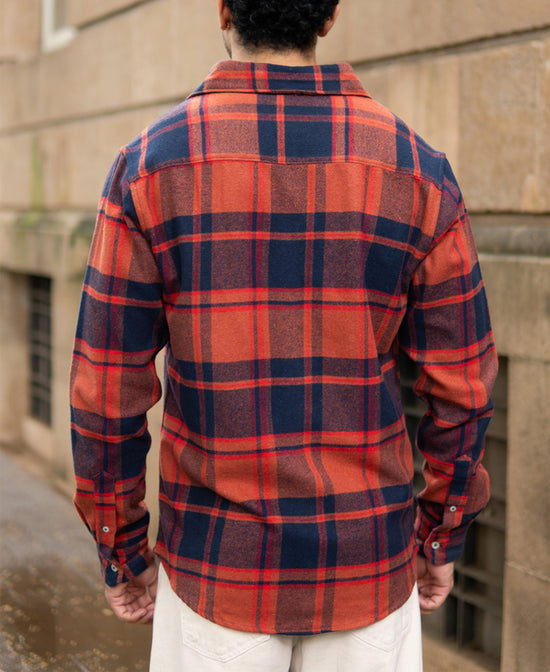 Checks, but with character. This shirt blends warm rust and deep navy in a bold checked pattern that feels equal parts rugged and refined. Made to be worn buttoned-up or layered open over a tee, it’s your go-to for days when you want effortless style with just the right amount of edge.