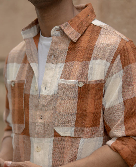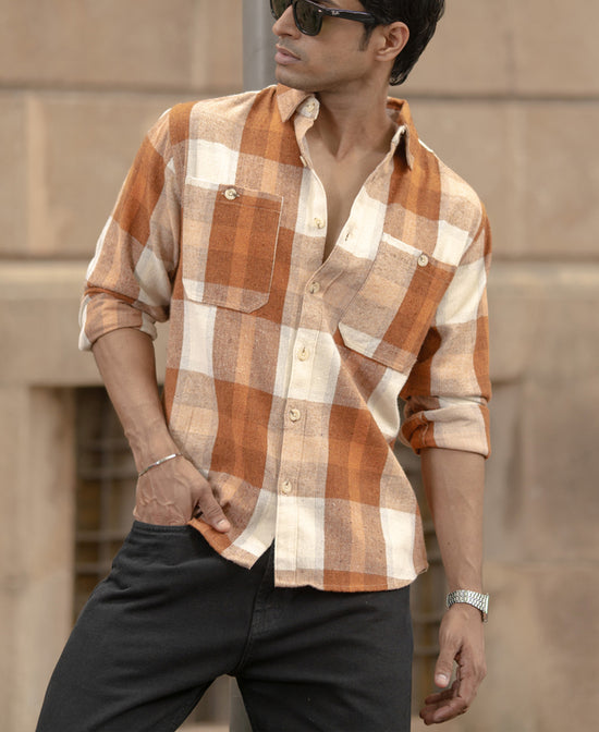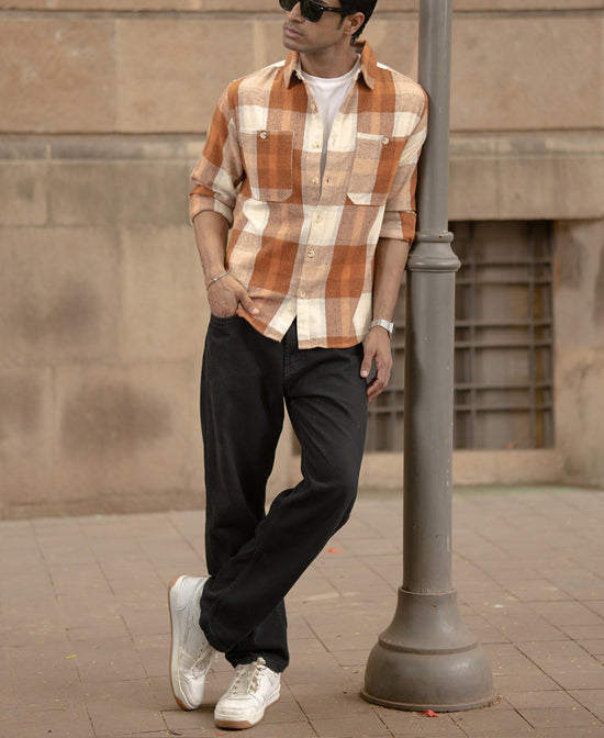 A must-have rustic charm for your collection. This Rust Checks Shirt With Pockets is designed with a classic checkered pattern in rust and cream. This shirt balances rugged appeal with timeless style. The dual front pockets elevate its utility, making it perfect for casual layering. Pair it over a white tee or button it up for a relaxed yet stylish ensemble.