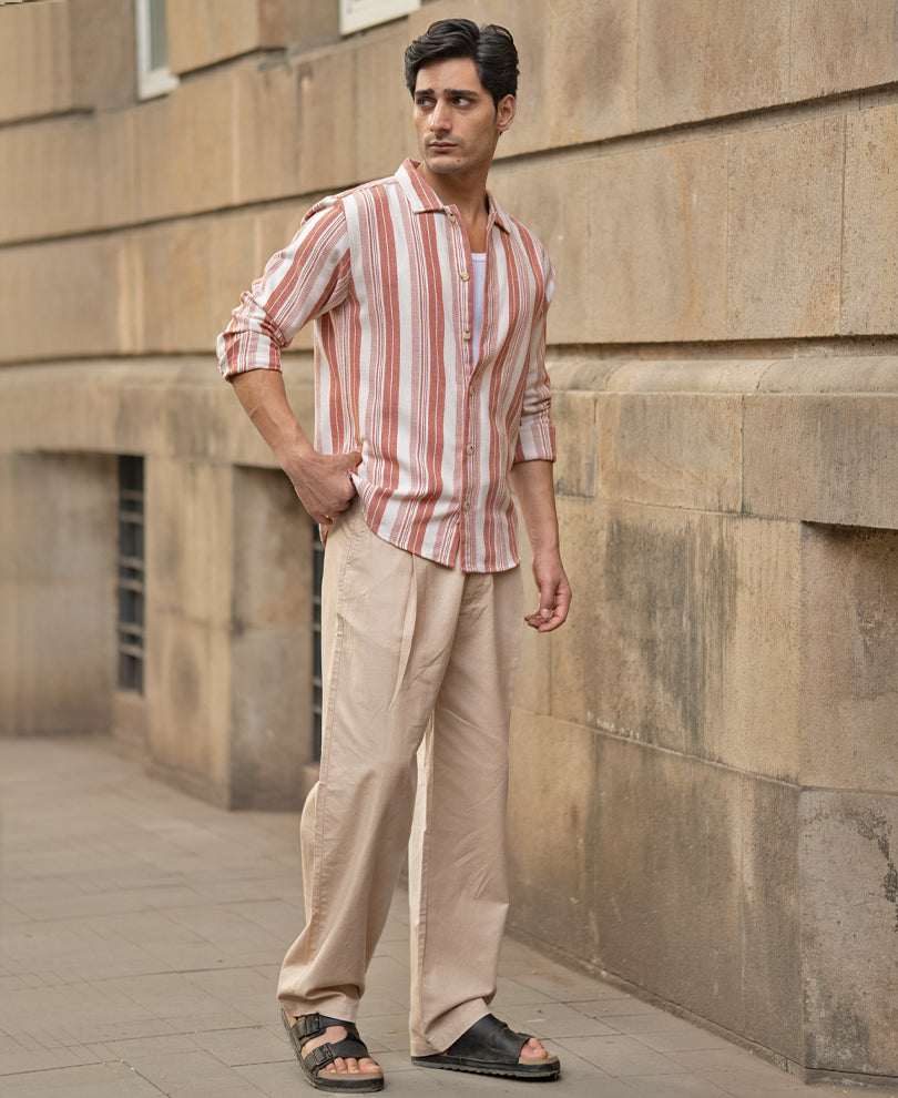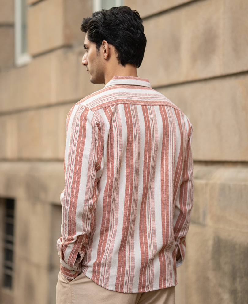 This shirt was made keeping uniqueness and daily charm in mind. The rust hue gives this shirt its bold personality, while the structured stripes keep things polished and intentional. It’s crisp, confident, and made for days when you want to stand out.