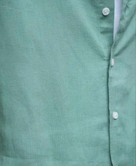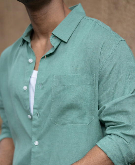 The Sage Green Linen Blend Regular Fit Shirt combines minimal design with all-day ease. Its breathable fabric and relaxed cut make it an essential for warm-weather dressing, while the muted green tone adds effortless sophistication.