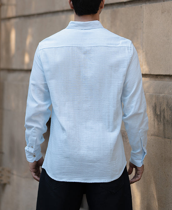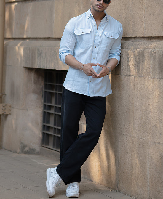 Sky blue with double pockets for a crisp, utilitarian feel. This full-sleeve shirt blends classic workwear elements with everyday comfort. Whether you wear it buttoned-up for a sharp look or open over a tee for a relaxed vibe, it’s got that effortless charm. Pair it with dark jeans and step out in style.