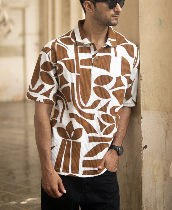 Bold brushstrokes of earthy tan on textured white; this polo is a walking canvas of cool attitude. The structured knit brings clarity to the chaos, while the sharp collar lets you channel art-meets-attitude. Wear it with chinos or denims when you want to stand out with calm confidence.