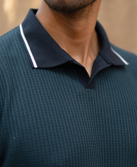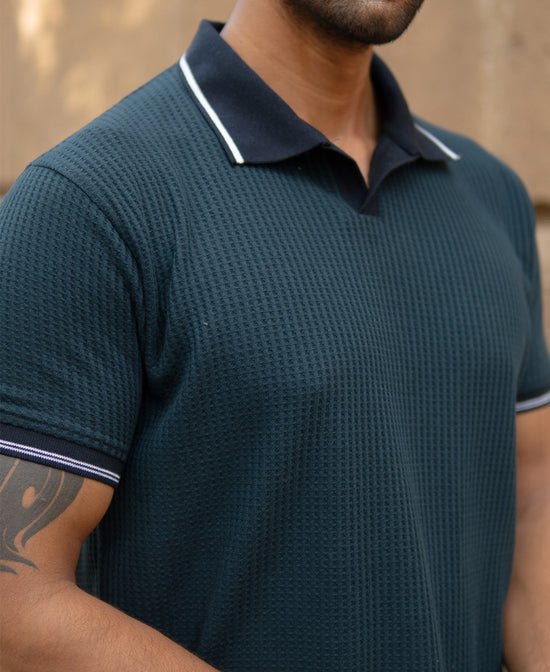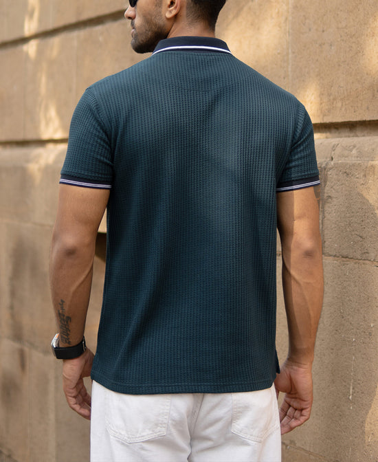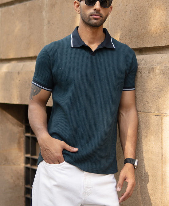 Bright, bold, and built to make your everyday cinematic. This Teal Contrast Collar T-Shirt brings effortless energy to your wardrobe. Crafted from soft, breathable fabric, it keeps you cool, while its regular fit ensures comfort with a classic silhouette. Whether paired with jeans for a casual day out or styled with shorts for a relaxed Super Sunday, this tee gives you endless ways to wear it.