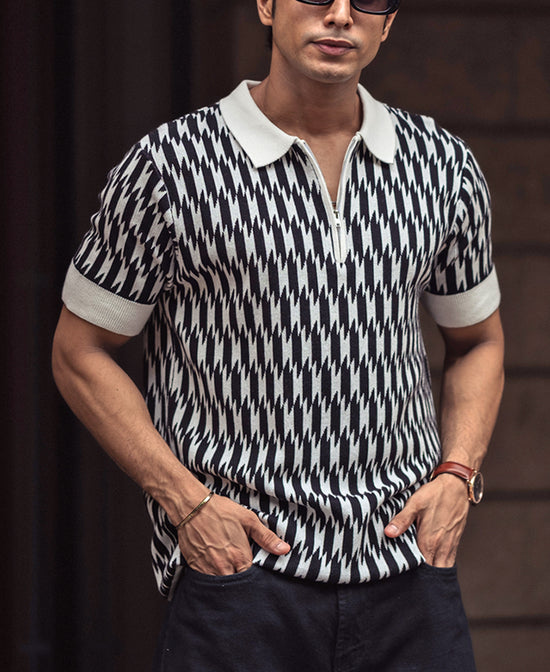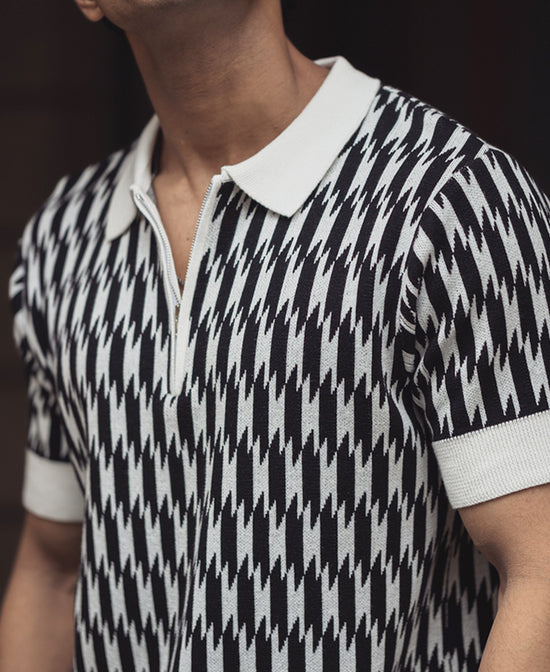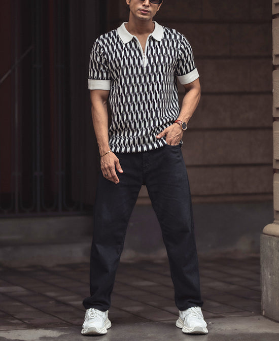 Complete your casual wardrobe collection with this white and black knitted zipper t-shirt. Crafted from 100% cotton, its jacquard knit and sleek zipper bring a smart touch to your look. Structured yet comfortable, it’s perfect for those who want everyday wear with a modern twist.