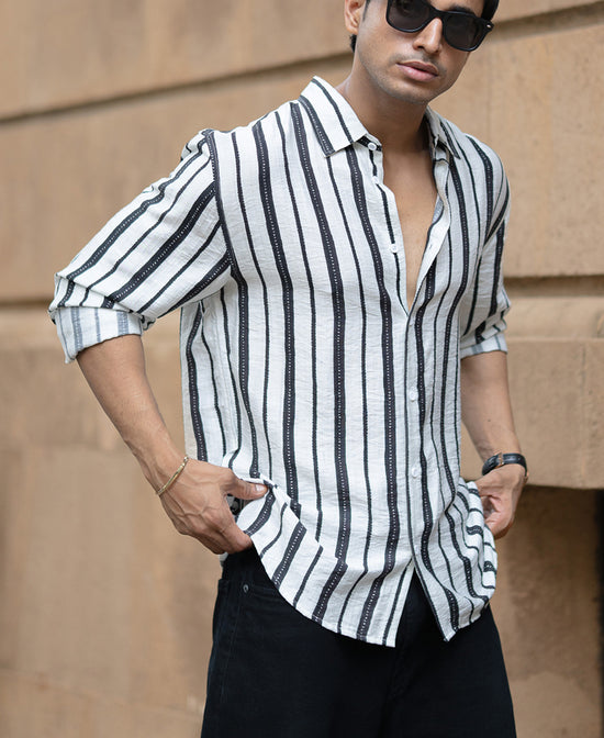 This White And Black Striped Flowy Shirt reimagines stripes with raw, uneven charm. Textured fabric, rich earthy hues, and a casual camp collar combine to create a laid-back essential that feels as effortless as golden hour. It's the kind of shirt that pairs just as well with beachy afternoons as it does rooftop nights.