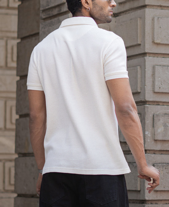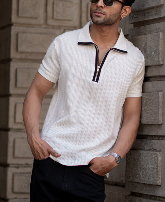 A little zip, a lot of swagger. This white structured t-shirt isn’t just another basic—it's the upgrade your wardrobe didn’t know it needed. Crisp, sharp, and effortlessly put together.