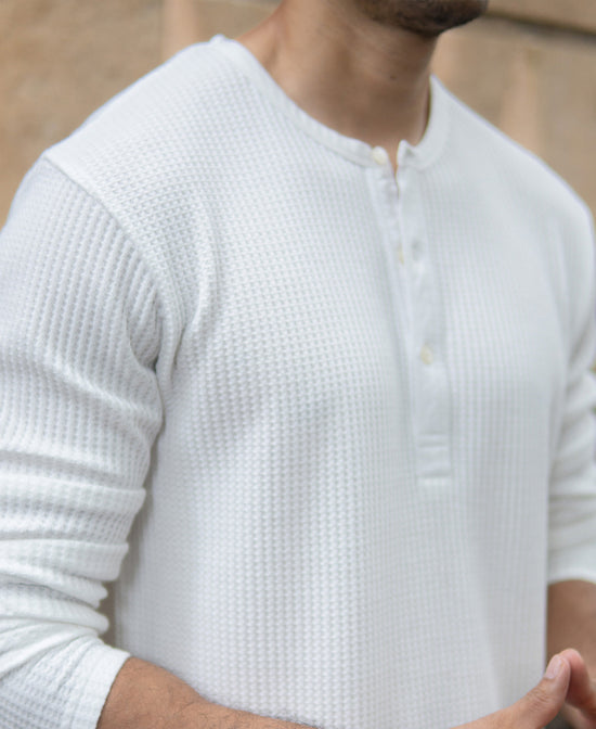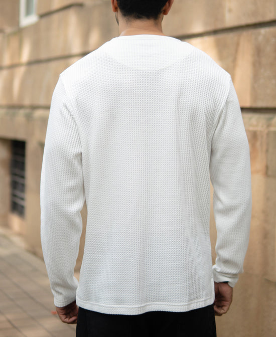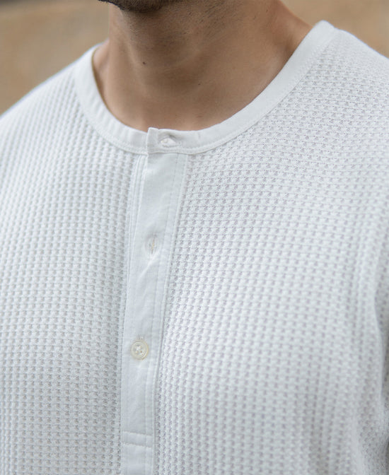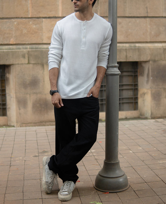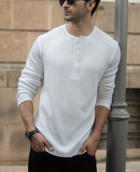 A soft, midweight knit in a crisp white tone, this Henley blends cosy texture with laid-back polish. Its three-button placket and subtle horizontal knit pattern add depth, while the relaxed cut makes it equally suited for layering or wearing solo.