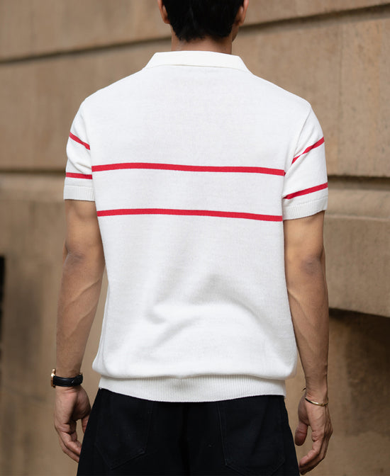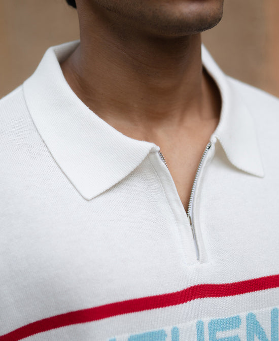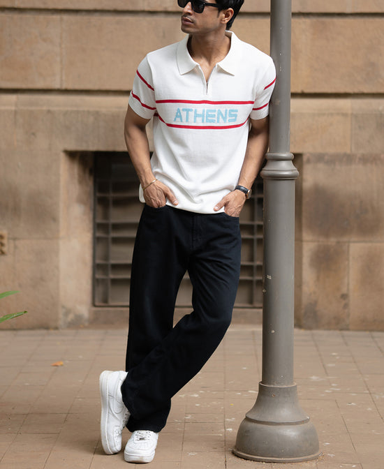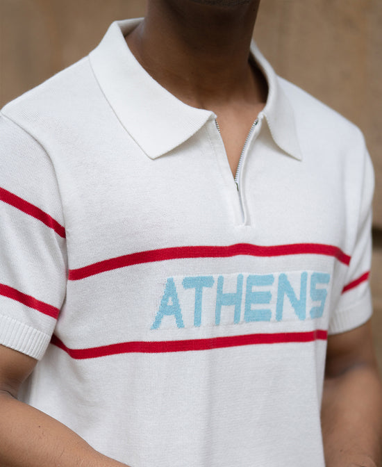 With bold “ATHENS” lettering and athletic red stripes, this knitted polo gives you vacation-core meets vintage-sport vibes. The half-zip and collar add structure, while the knit texture makes it feel luxe without being loud. Pair with dark denims or linen shorts either way, you’re serving Mediterranean mischief.