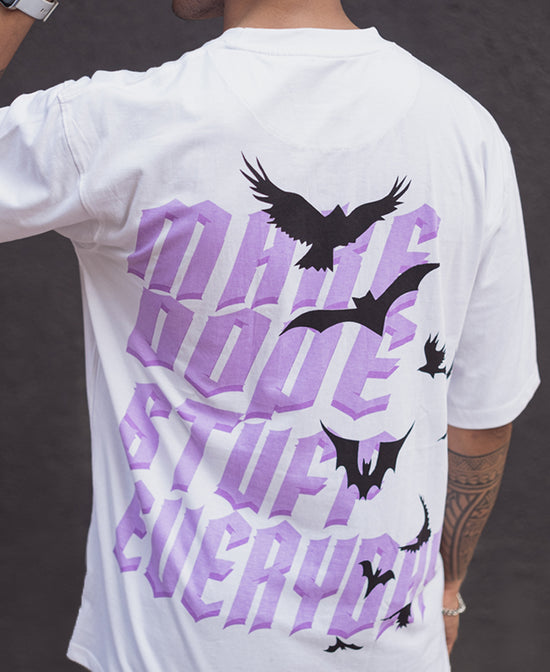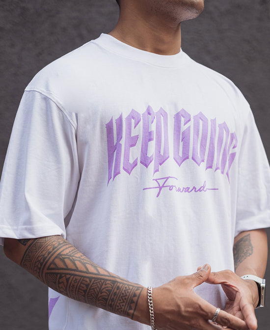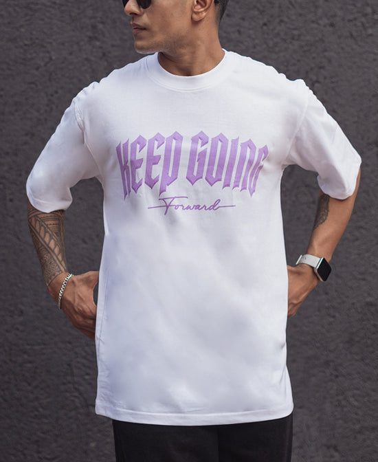 Stay motivated in style with our white "Keep Going" print oversized t-shirts for men, featuring an inspiring purple text design, ribbed neck and drop shoulders. Made from premium fabric for ultimate comfort, it's perfect for casual outings. Pair with baggy jeans or shorts to inspire trends on the go.