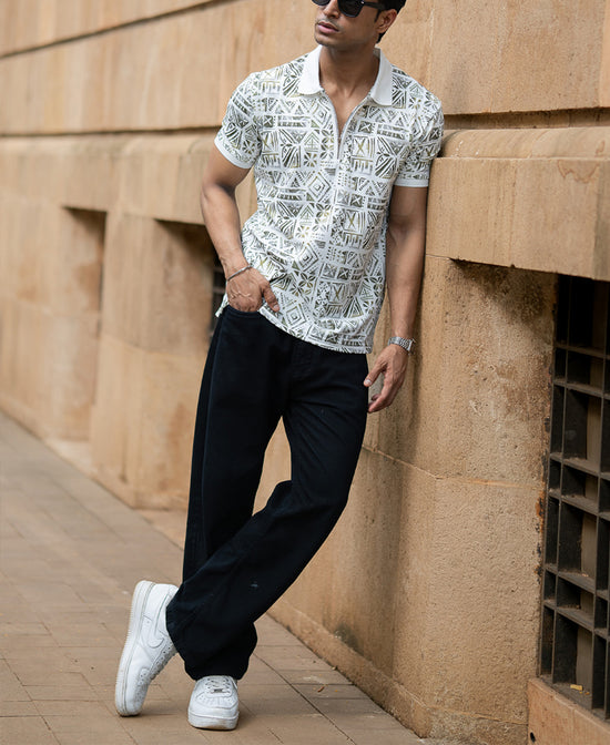 A modern mosaic of tribal-inspired geometry, this white printed polo brings a fresh spin to casual style. Crafted in breathable knit fabric, it’s light, lively, and ready for sunny escapades. Pair with monochrome trousers or denim shorts for an instant upgrade.