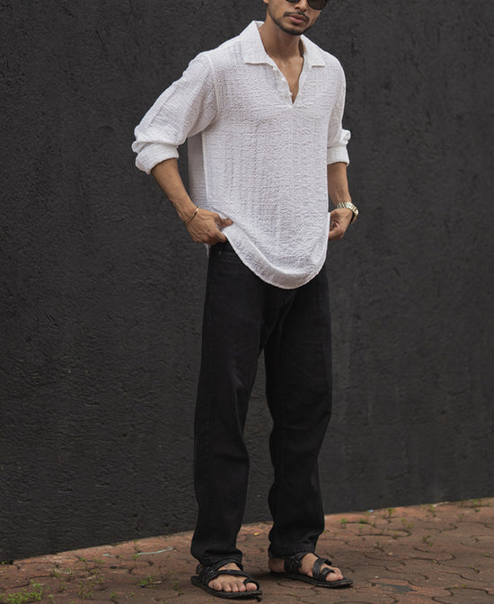 A nod to tradition, with a step into today. This white kurta-style shirt brings that clean, easygoing vibe that just feels right—it’s a modern classic, designed to keep things effortless but never boring.