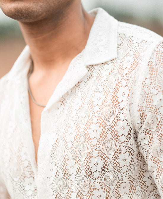 Blow minds with our amazing collection of crochet shirts for men. Made with crochet fabric that is perfect for all-day comfort and posh style, the crocheted shirt has a Cuban collar, full sleeves, an all-over crochet pattern, and a round hem. Pair it with black denim jeans or tailored trousers for a neat statement look.