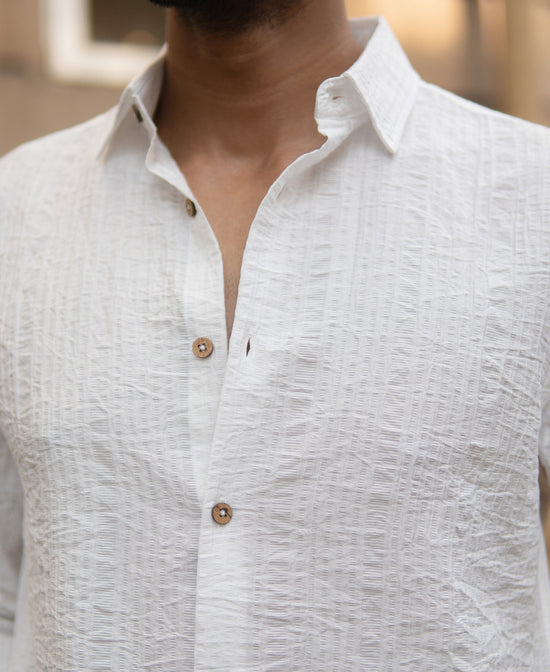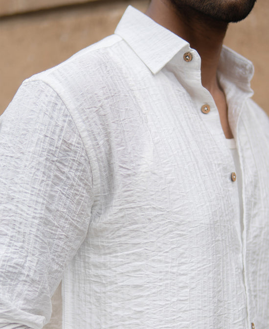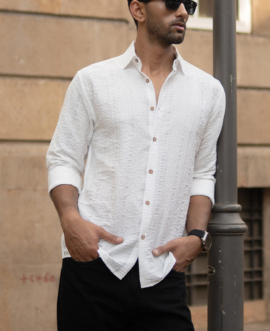 This white textured shirt gives classic fresh a structured upgrade. With woven vertical patterns that catch the light and a breathable, breezy build, it walks the line between tailored and laid-back. Perfect for Sunday brunch or a rooftop sundown.