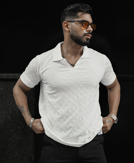 Redefine casual chic with our white structured half sleeves t-shirts for men, made from soft, high-quality fabric, featuring an intricate embossed pattern and a modern collar. Ideal for casual Fridays or weekend adventures, this shirt pairs seamlessly with black trousers or denim jeans, making it a versatile piece for any wardrobe.