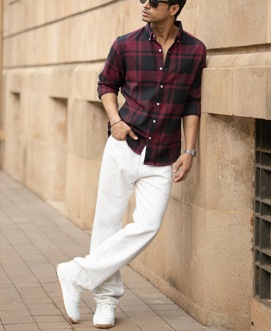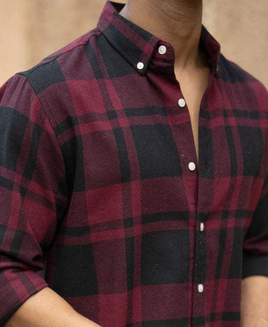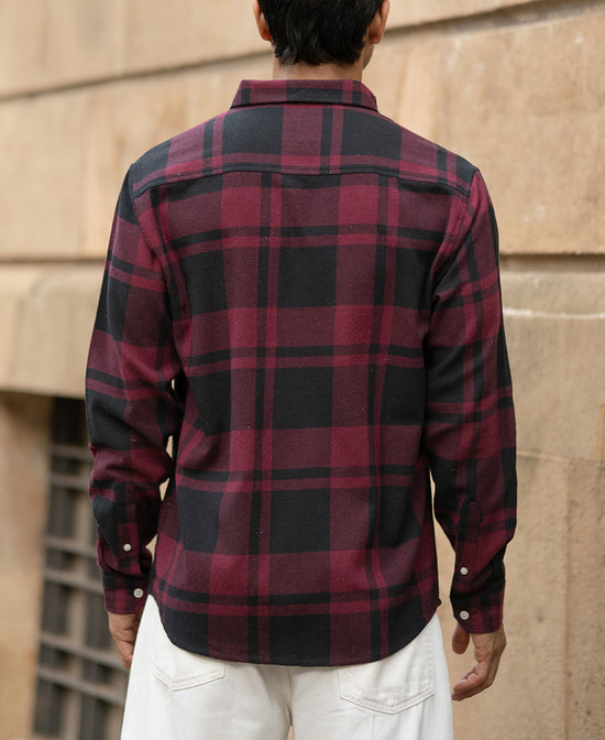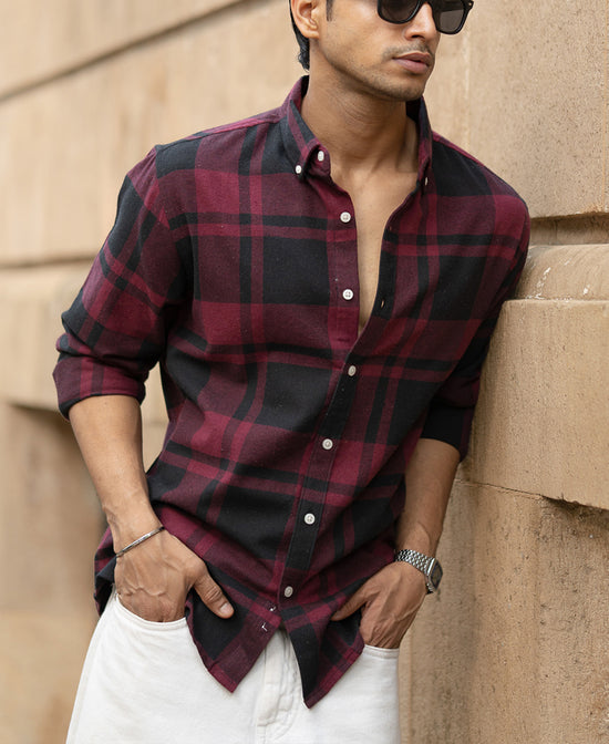 This wine and black flannel shirt is all about contrast, deep tones, rugged feel, and clean silhouette. It's warm but breathable, making it perfect for layered fits or solo styling. For the days when you want your look to hit hard without trying.