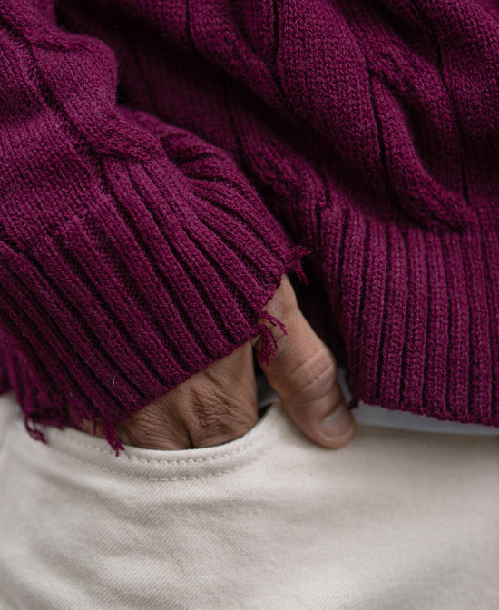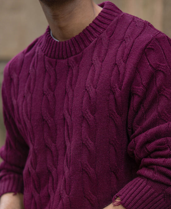 Classic, comfortable, and undeniably refined. The wine cable knit sweater is spun from soft yarn with a detailed ribbed pattern that adds depth and texture. A timeless winter staple that layers perfectly over shirts or stands strong on its own.