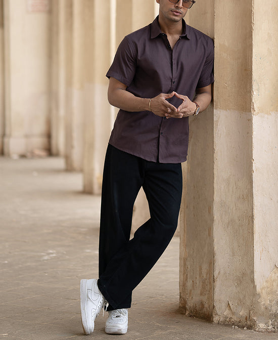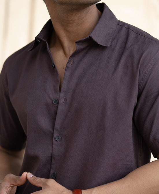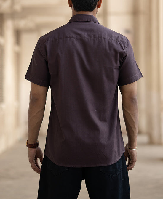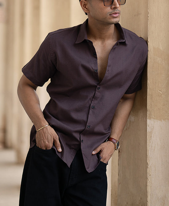 Lightweight cotton shirt in a rich coffee tone, tailored for a relaxed drape. Features a clean collar, easy short sleeves, and a straight hem with curved sides; delivering breezy comfort with a touch of polish.