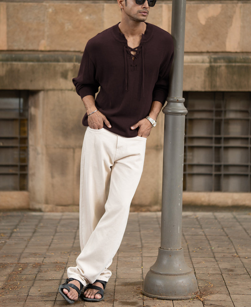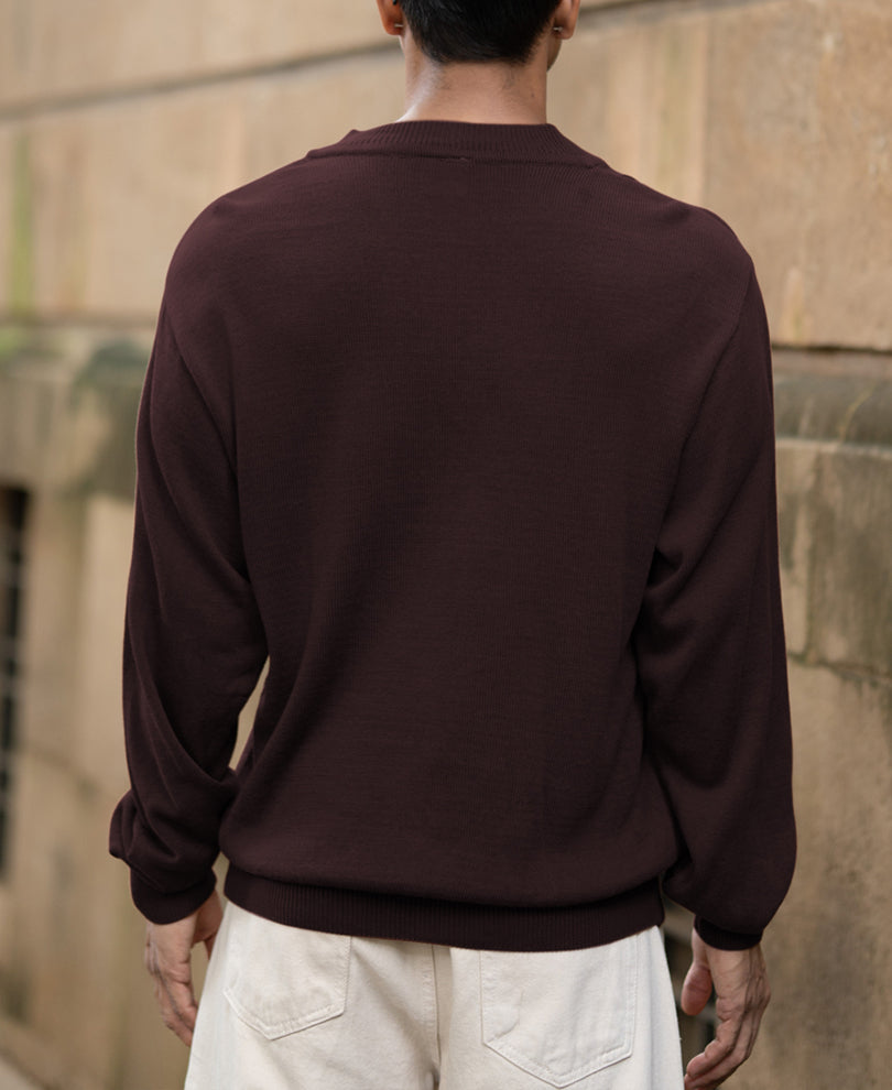 Deep wine hues meet a soft knitted texture in this Henley T-shirt. Featuring a buttoned placket that’s equal parts casual and charming, it’s the piece you’ll reach for when you want effortless sophistication. Pair it with denim for a drink out, or layer it under a jacket for quiet confidence.