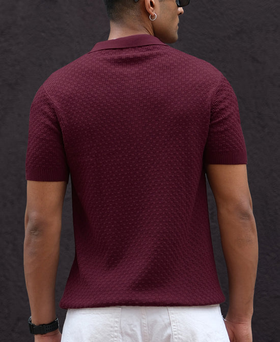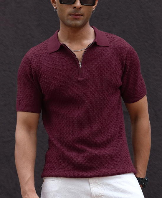 Discover effortless elegance with our Wine colored structured t-shirt for men, featuring a polo collar, a ribbed texture and a sleek quarter-zip neckline. The short sleeves and premium lightweight fabric make it perfect for warm days at the office or evening drinks. Pair with black/white jeans for a crisp, polished look that transitions seamlessly from day to night.