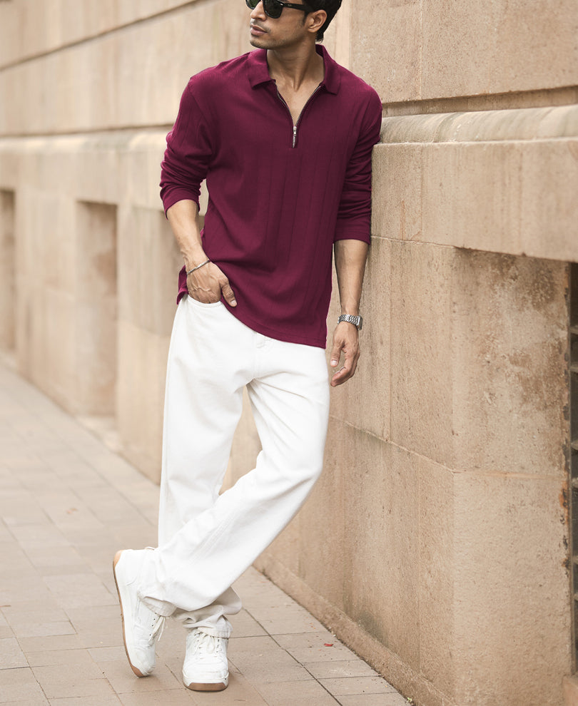 Think of it as your inner soul searcher. This wine zipper polo blends a luxe knit texture with a deep, standout hue that makes it the first pick for weekends and party nights. Strong on its own, even better with accessories or layers.