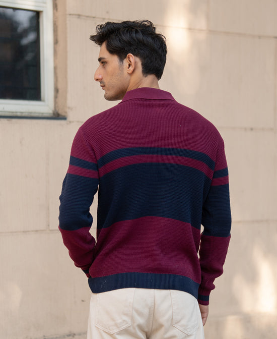 A sweater that knows how to make an entrance to the eyeballs. Looks like a T-shirt warms you like a sweater, this rich wine hues paired with navy stripes give this knit a refined yet easygoing feel. The textured knit pattern adds depth and warmth, while the collared neckline brings a touch of polish. Pair it with chinos for date nights or denim for casual city strolls — it’s your winter MVP.