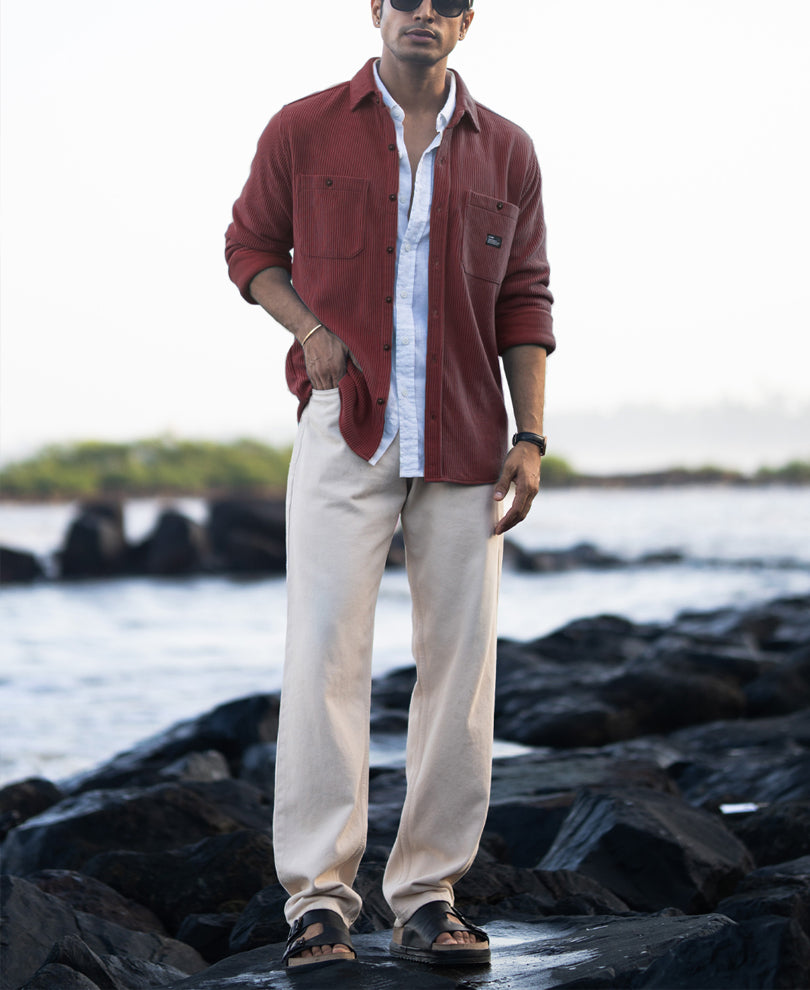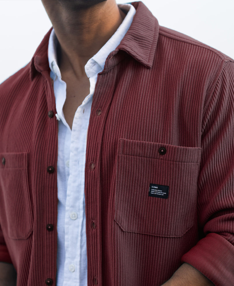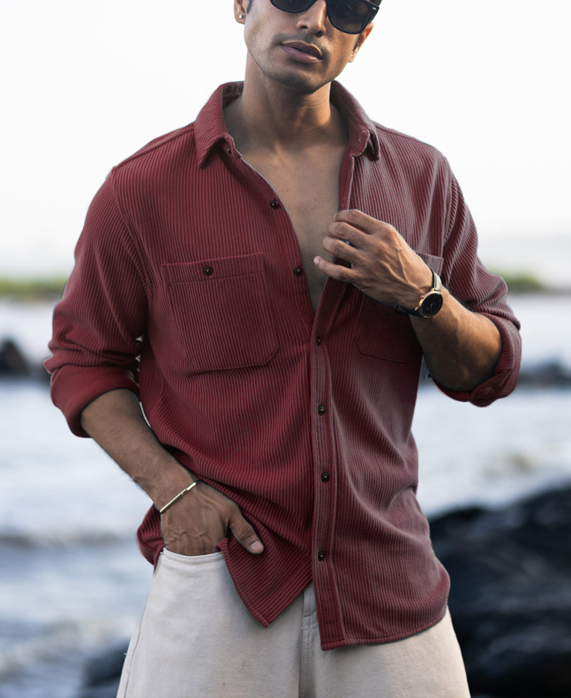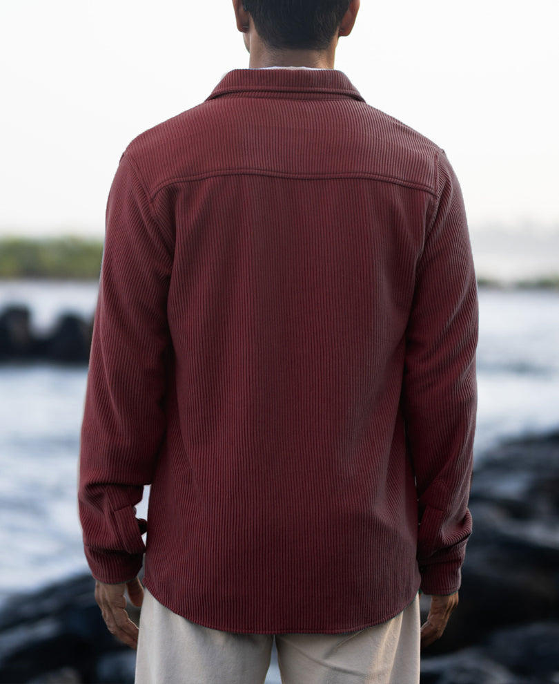 This wine knit shirt features a refined texture and front utility pockets that add subtle depth to its minimal design. Tailored for a sharp fit with the comfort of knitwear, it works just as well under a jacket as it does layered over your white tees.