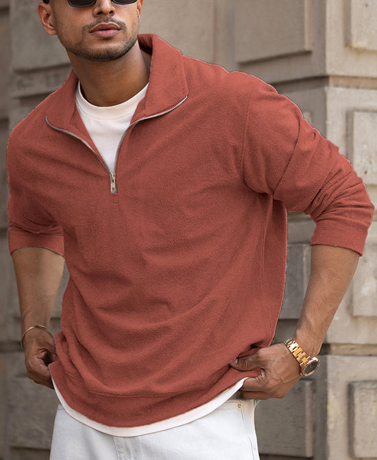 Brick red that builds a strong style foundation. This quarter-zip polo t-shirt is for men who like functional fashion. The zip detail adds versatility, while the rich tone ensures your look is always on point. It’s casual, confident, and just the right amount of bold.