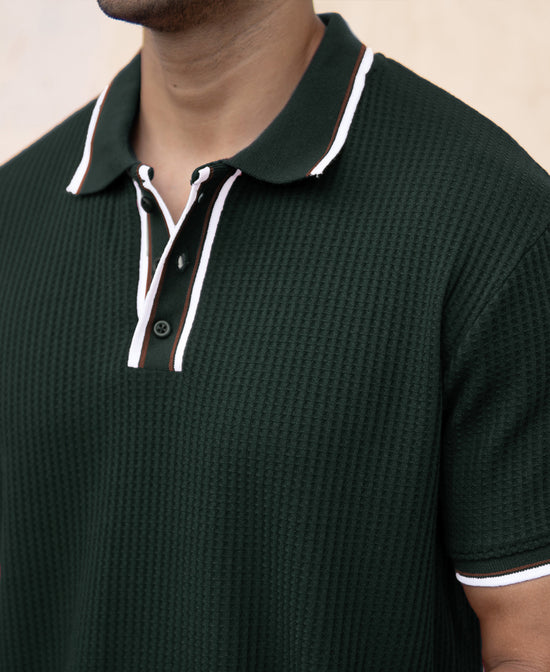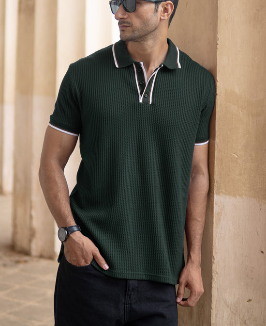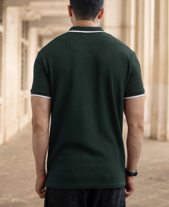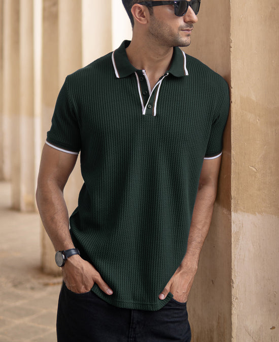 Built for timeless style and especially for the people with a sporty soul. This Pine Green Structured Polo T-Shirt delivers texture and tone that whispers elegance but still flexes laid-back cool. The crisp tipping detail on the collar adds definition; literally pair it with anything, and you’re ready.