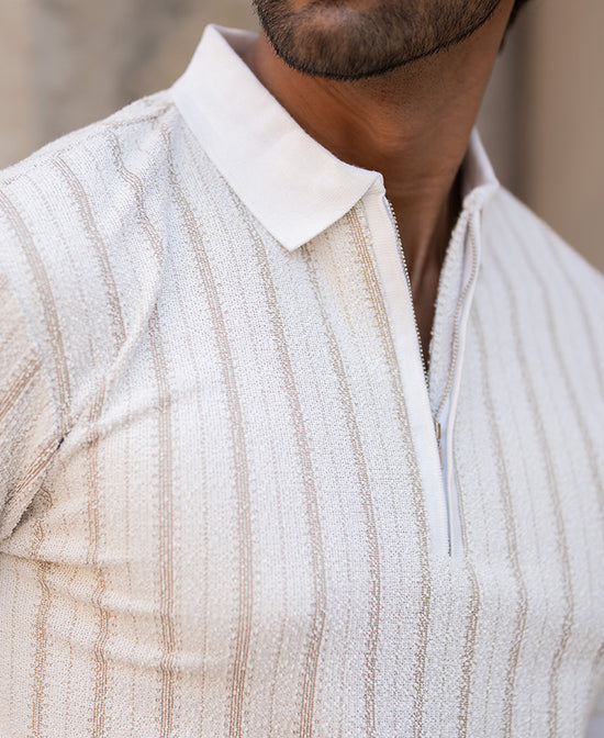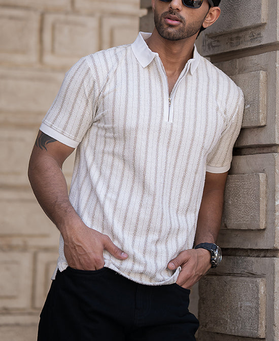 A polo that plays by its own rules. This white striped contrast polo t-shirt brings a fresh, sporty edge with bold stripes and a sleek collar. The regular fit keeps it comfortable, while the contrast detailing adds just the right amount of attitude. A go-to for guys who like their polos with a bit more personality.